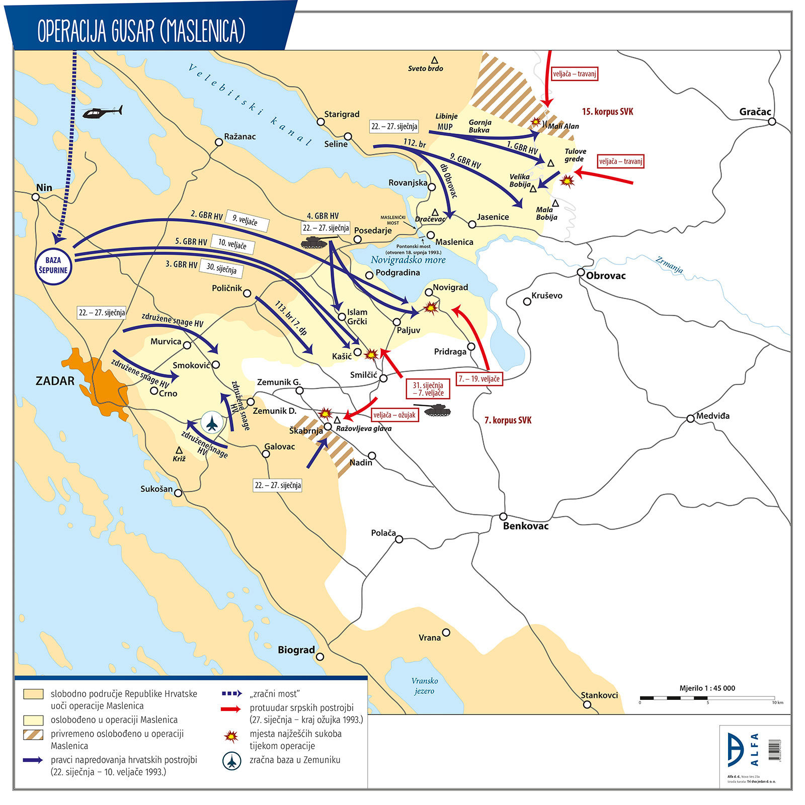 Borbena djelovanja odvijala su se u zadarskom zaleđu i području južnog Velebita, kao i širem području srednje Dalmacije. Zbog dugačke linije bojišnice (oko 100 km) i velikog broja postrojbi koje su se smjenjivale, hrvatska obrana organizirana je u pet sektora (tzv. modularni sustav). S obzirom na to da je srpska strana postupno dovodila najjače sastave, hrvatska strana morala je učinkovito reagirati te u borbu uključiti najbolje postrojbe gardijskih, kao i pričuvnih brigada, uglavnom organiziranih u taktičke grupe. Radi hitnog djelovanja pojedini dijelovi TG 2., 3. i 5. gbr HV prebačeni su helikopterima te izravno uvođeni u borbe za Kašić i Novigrad. U borbe na Velebitu od veljače se kao nositelj obrane uključila TG 1. gbr HV Tigrovi. Kasnije je uvedena TG 7. gbr HV Pume koja je preuzela linije od BG 113, odnosno djelovala na području Suhovara, u napadima na selo Drače, a kasnije je interventno premještena na bojišnicu šibenskoga zaleđa. Zbog intenziteta borbenih djelovanja dijelovi taktičkih grupa gardijskih brigada na ovoj bojišnici smjenski su djelovali gotovo cijele 1993, a snage TG 1. gbr HV Tigrovi zadržale su se na Velebitu do lipnja 1994. U obrambenim aktivnostima aktivno su sudjelovale i pričuvne postrojbe HV, kao i postrojbe mornaričkog pješaštva Hrvatske ratne mornarice. Obrana ostvarenih ciljeva postignutih operacijom Gusar (Maslenica) bila je daleko teži dio bitke za zadarsko zaleđe i Velebit. Obje strane u tom sukobu imale su višestruko veće gubitke nego u prvih pet dana koliko je službeno trajala operacija.